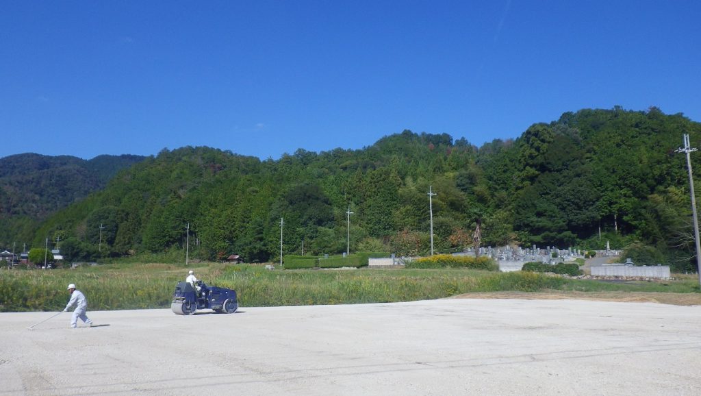着工前、敷地はでこぼこしており、ところどころ水たまりがある状態でした。天気の状況を見計らって、除草、掘削運搬埋戻し、不陸整正、砕石搬入、路盤工とテンポよく作業しました。