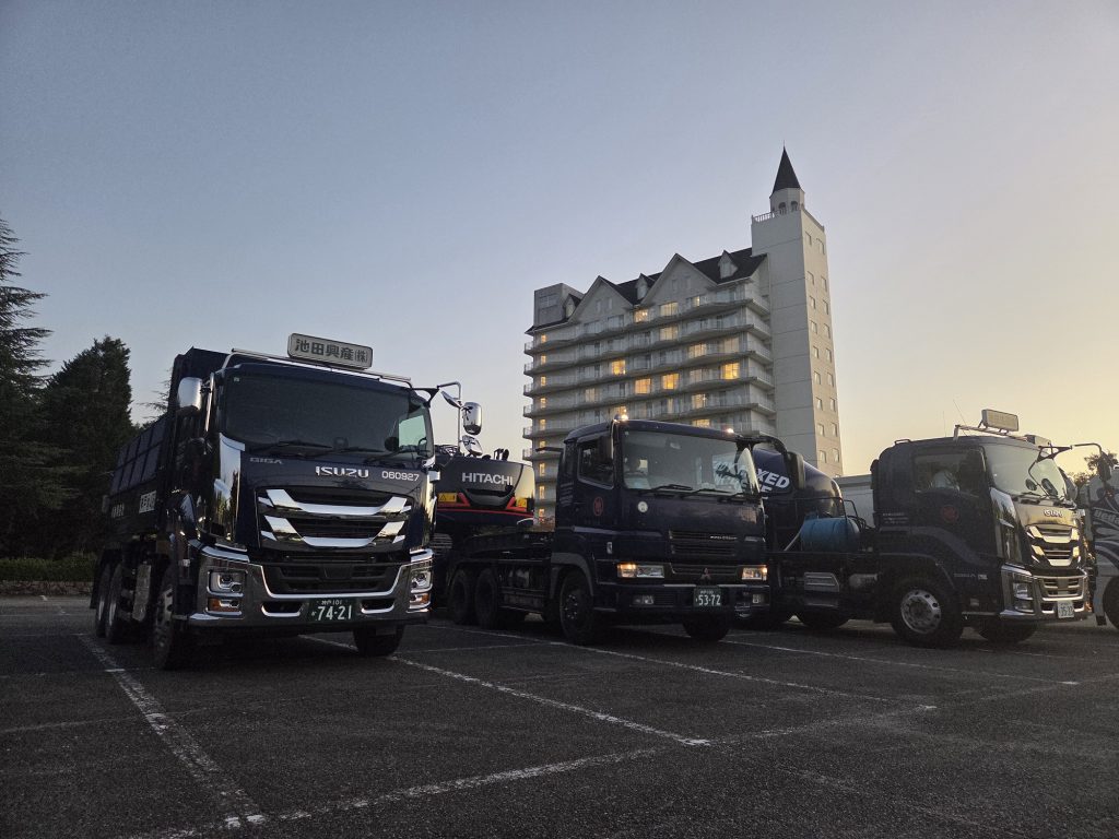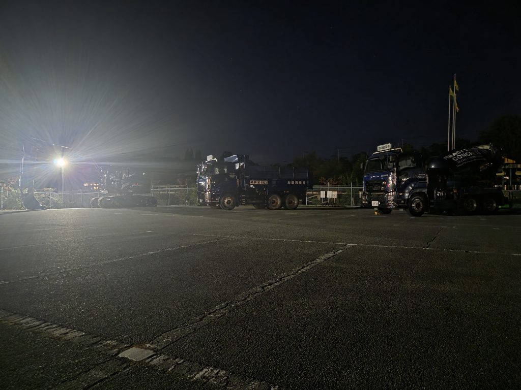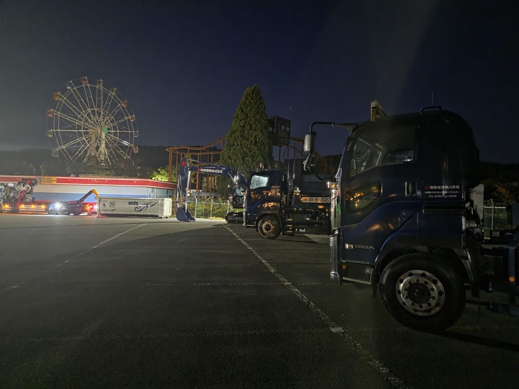 前日おもちゃ王国さまが閉館されてから重機車両を搬入していきます。毎年の恒例となっております。