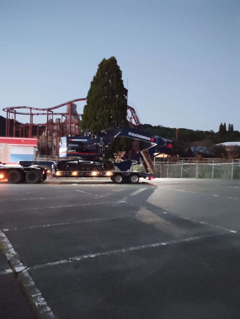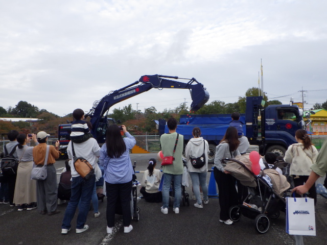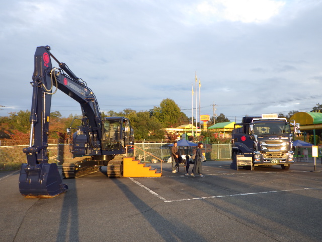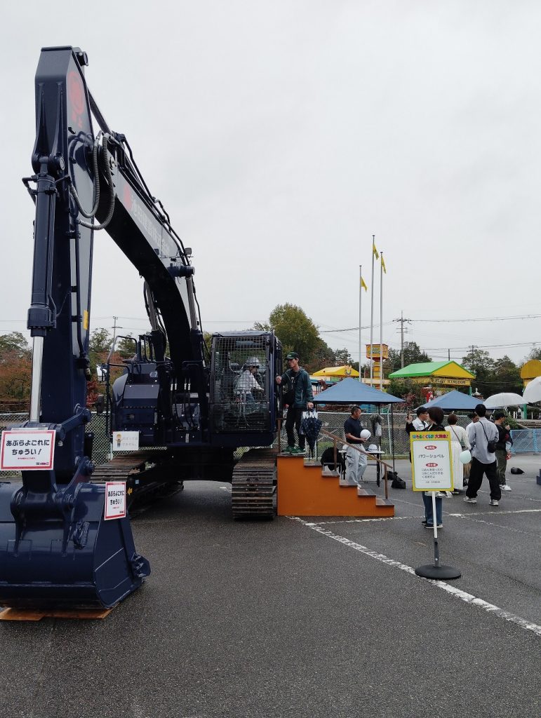 二日目の15時30分からのデモンストレーションでは王国のチーフさんに指示いただき、バックホウ・ダンプカー・ミキサー車を実際に動かして、来場のお客様に披露させていただきました。うまく操縦や運転が出来るのか冷や汗をかきました。